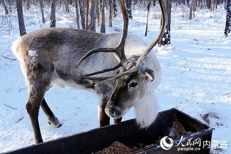 在敖鲁古雅鄂温克民族乡生活的驯鹿,主要以干苔藓、豆饼、麦麸等为食。实习生 牛佳摄